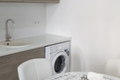 В кухонной зоне есть вся необходимая мебель и посуда, а также электрический чайник, варочная поверхность, СВЧ-печь, стиральная машина и холодильник.